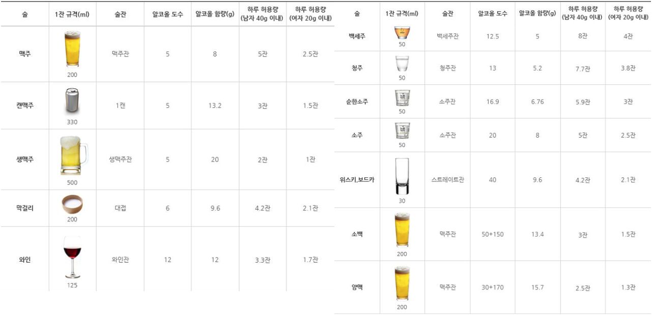 사실 가이드라인 상으로는 1주일 10잔과 하루 4잔을 모두 지켜야하지만 하루 4잔을 훌쩍 넘어버리는 자리가 많으므로..