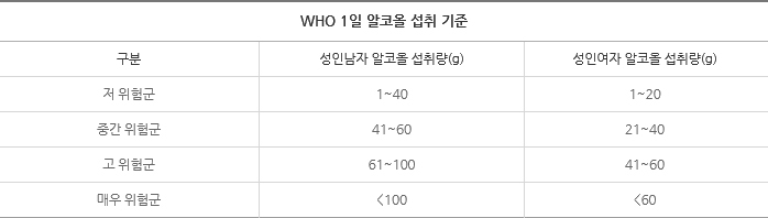 호주의 음주 관련 가이드라인 펌 얼추 알코올 40 g까지 마시라는 뜻으로 나옵니다. 첨언 하자면 최근에 나오는 뉴스나 연구결과에 의하면 ALDH2*2를 포함해 술로 인한 홍조가 나타나는 분이라면 술을 안 마시는 것을 권유하고 있긴 합니다.