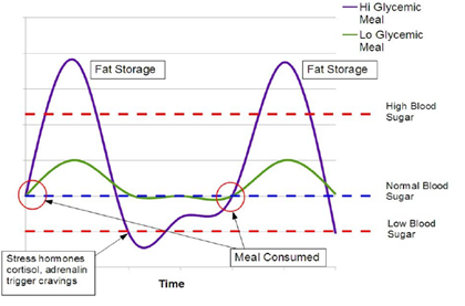 3. 인슐린이 많이 분비가 되어서 정상 혈당으로 되돌려놓았을 때 적당히 효과가 끝나면 좋겠지만 기저선보다 더 아래로 혈당을 낮춘다. 그렇게 되면 몸에서 낮아진 혈당에 대한 반응은 다시 배고파지게 되는 것이다. 다시 배고파질때 일반적으로 간식을 할 가능성이 높아지고, 이러한 상태가 몇달, 몇년을 지속하면 통계상 먹는 횟수가 증가하게 된다. 그리고 이런 부분들이 결국엔 식습관을 형성하고, 체지방률을 결정하고, 더 장기적으로 보았을 때는 성인병 발병확률까지 결정하게 된다고 보는 것이다.